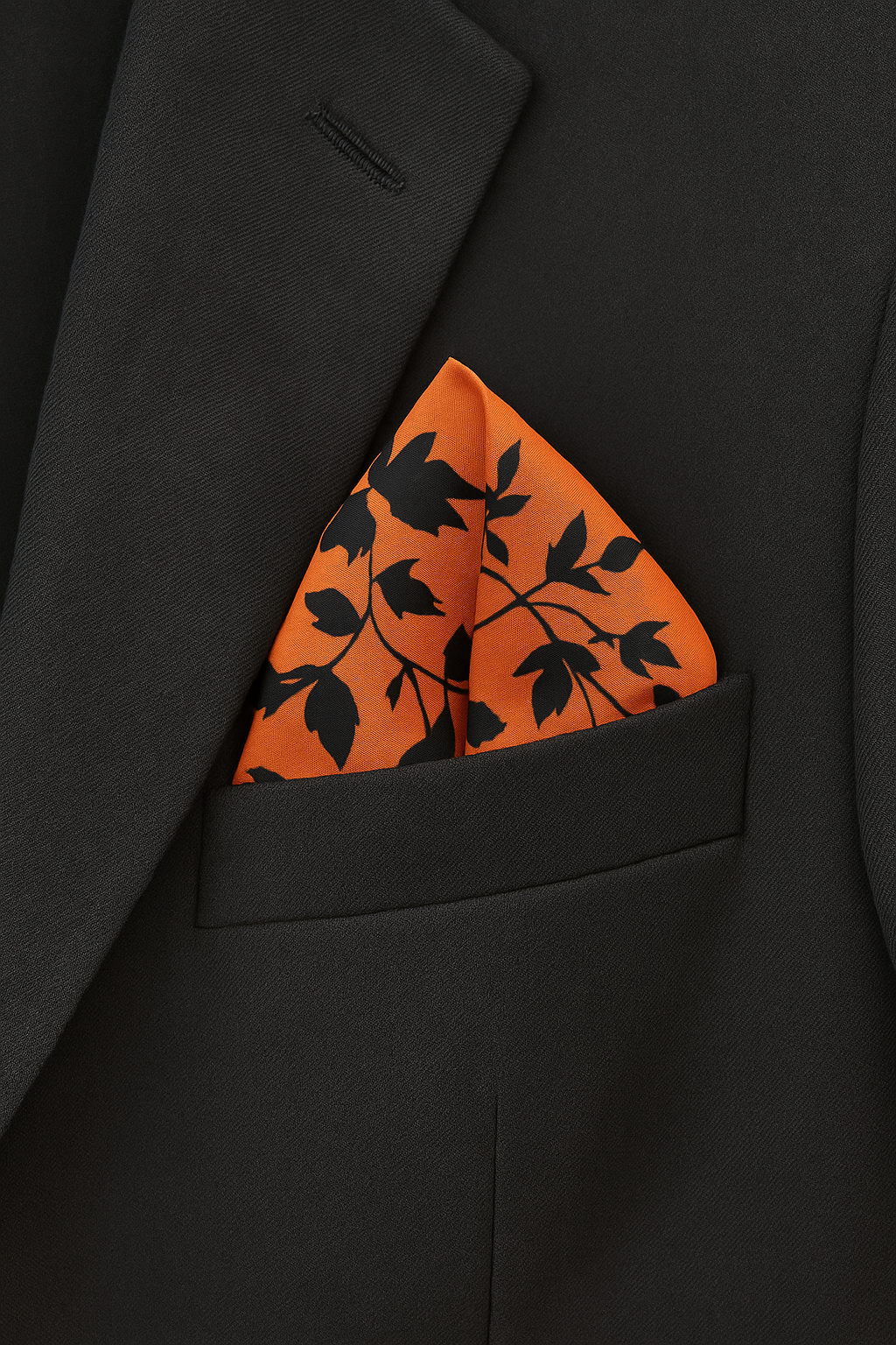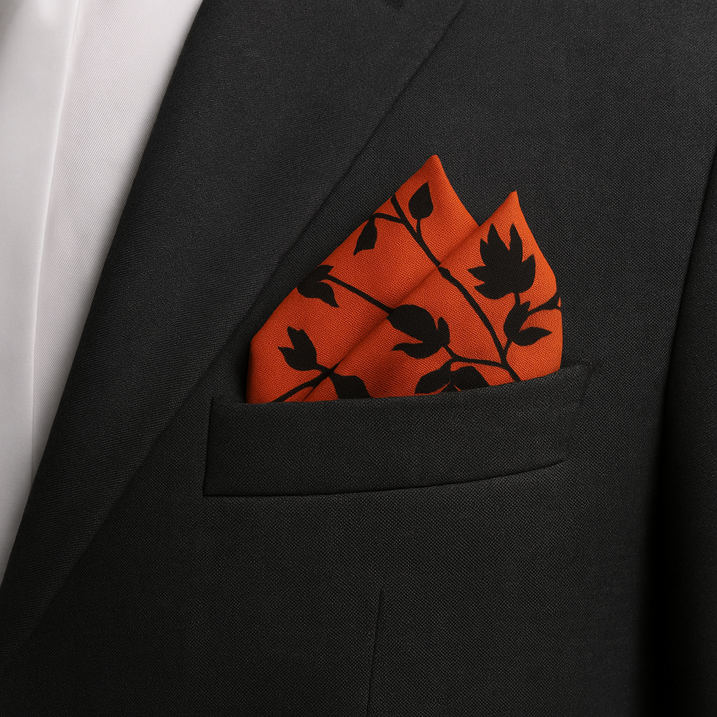 Autumn Shadow embodies the warmth and depth of the fall season. Its rich burnt-orange base contrasted with bold black floral patterns creates a striking yet sophisticated look. Perfect for adding character to any suit, this pocket square reflects timeless elegance with a touch of seasonal flair. Ideal for evening wear or autumn-inspired ensembles.