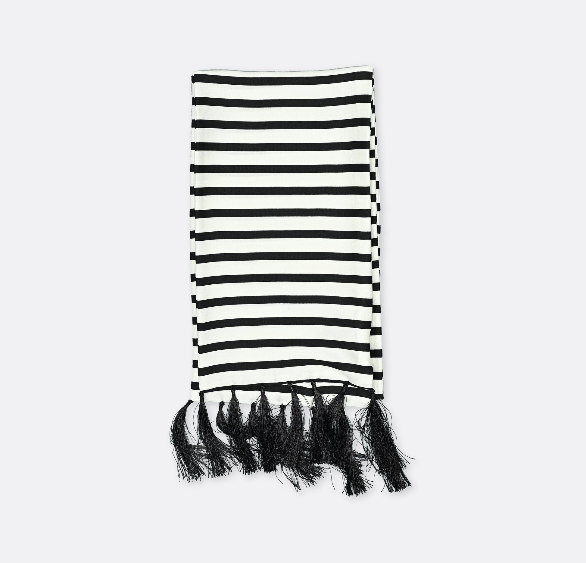 Timeless and graphic, this pure silk scarf features crisp black-and-white stripes for bold, modern contrast. Smooth, lightweight, and elegant, it drapes effortlessly over tailoring or smart-casual layers. Perfect for business, weddings, or evening style—pairs flawlessly with navy, charcoal, or black.