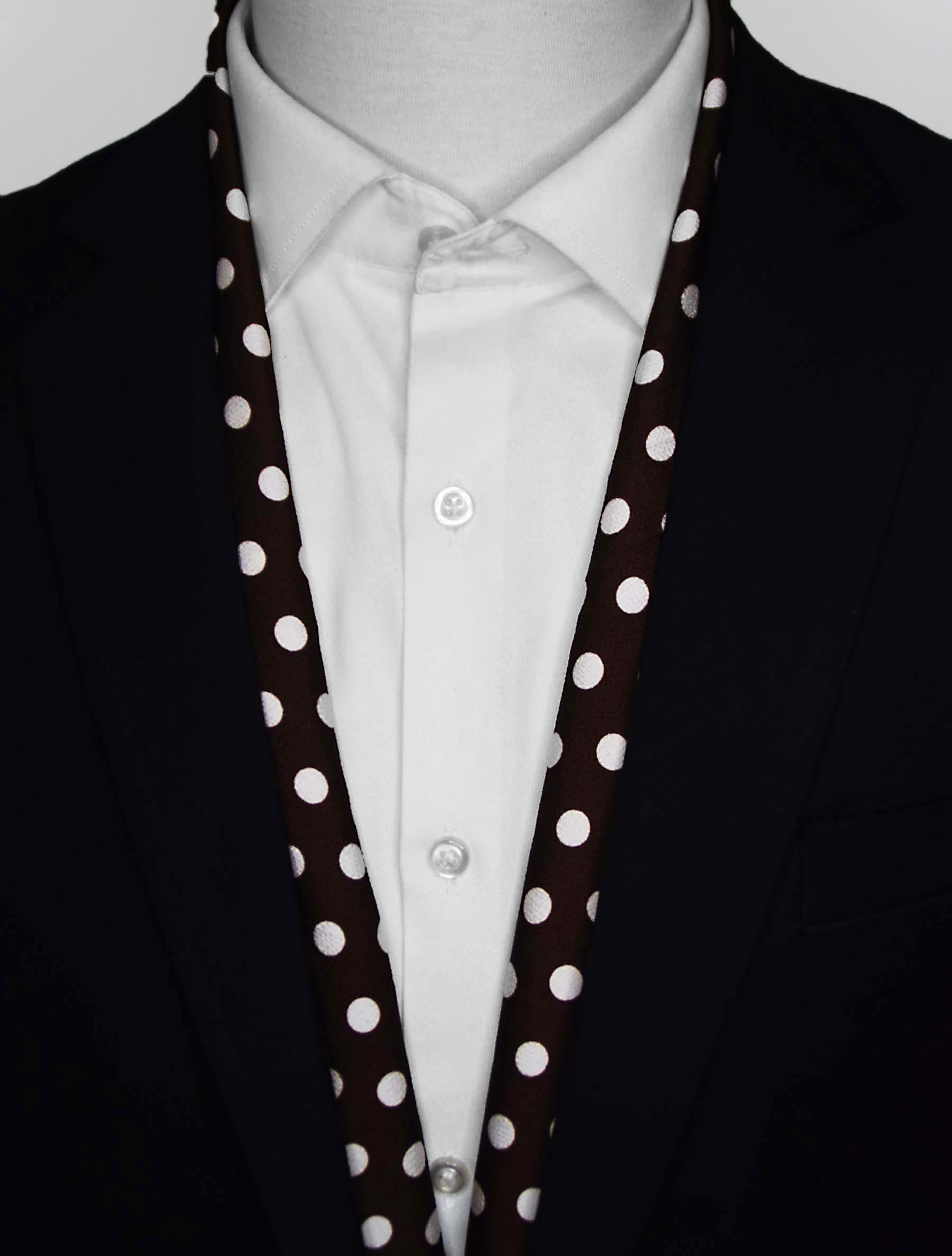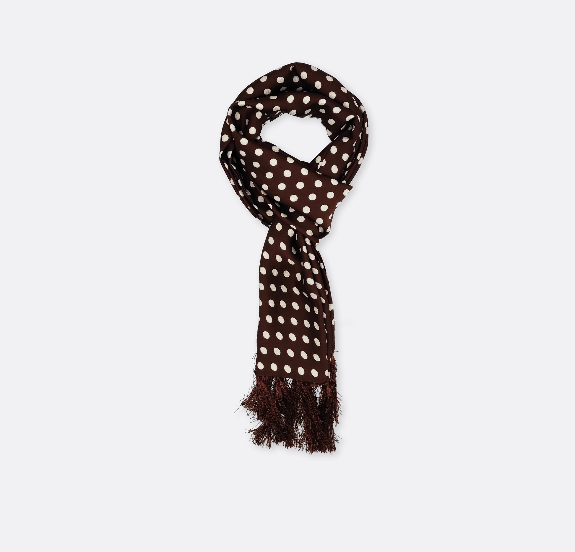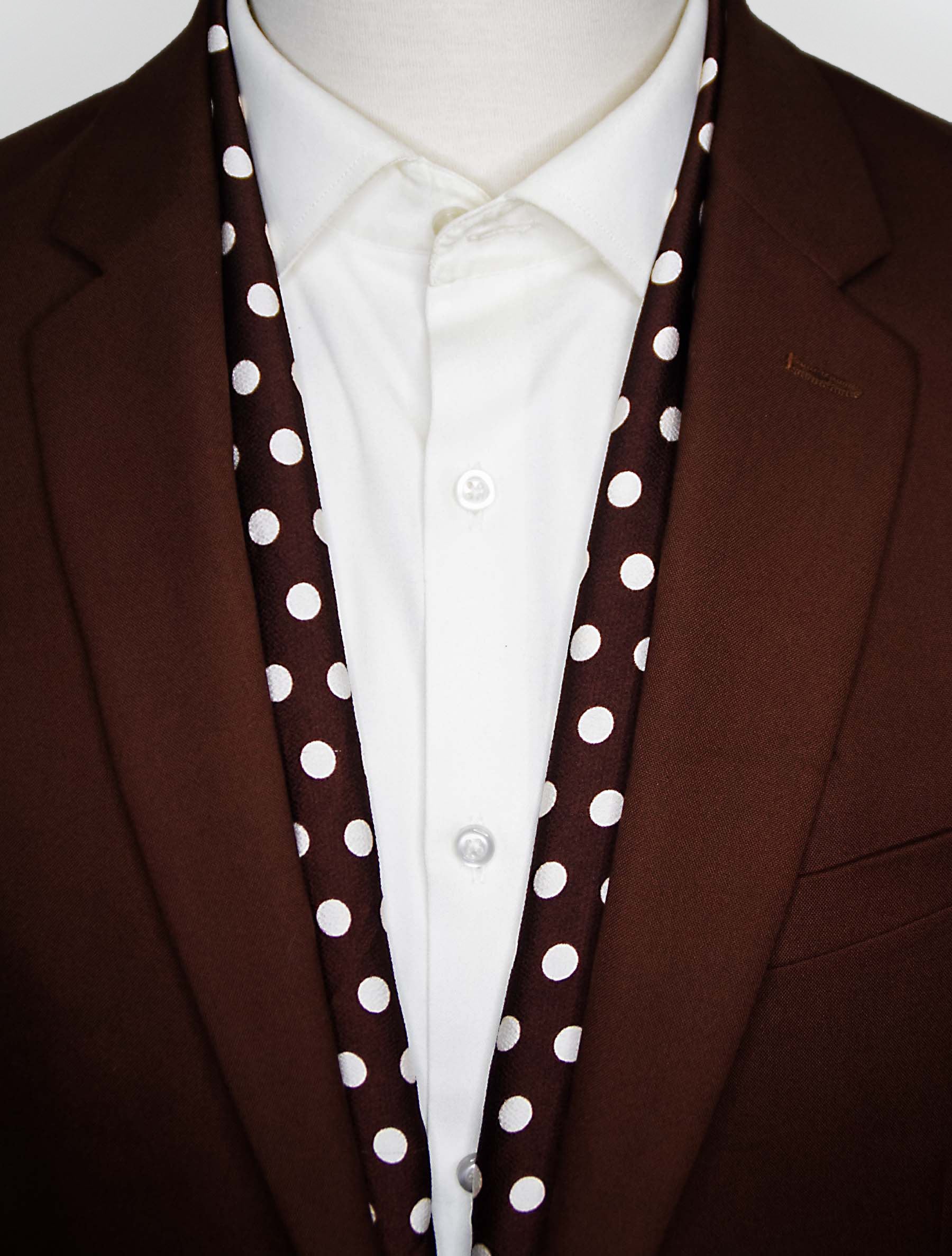 Rich and dapper, this pure silk scarf features a deep coffee backdrop punctuated by crisp polka dots for classic charm. Smooth, lightweight, and elegant, it drapes effortlessly over tailoring or smart-casual layers. Ideal for weddings, evenings out, and sharp office days—pairs perfectly with navy, cream, tan, and charcoal.