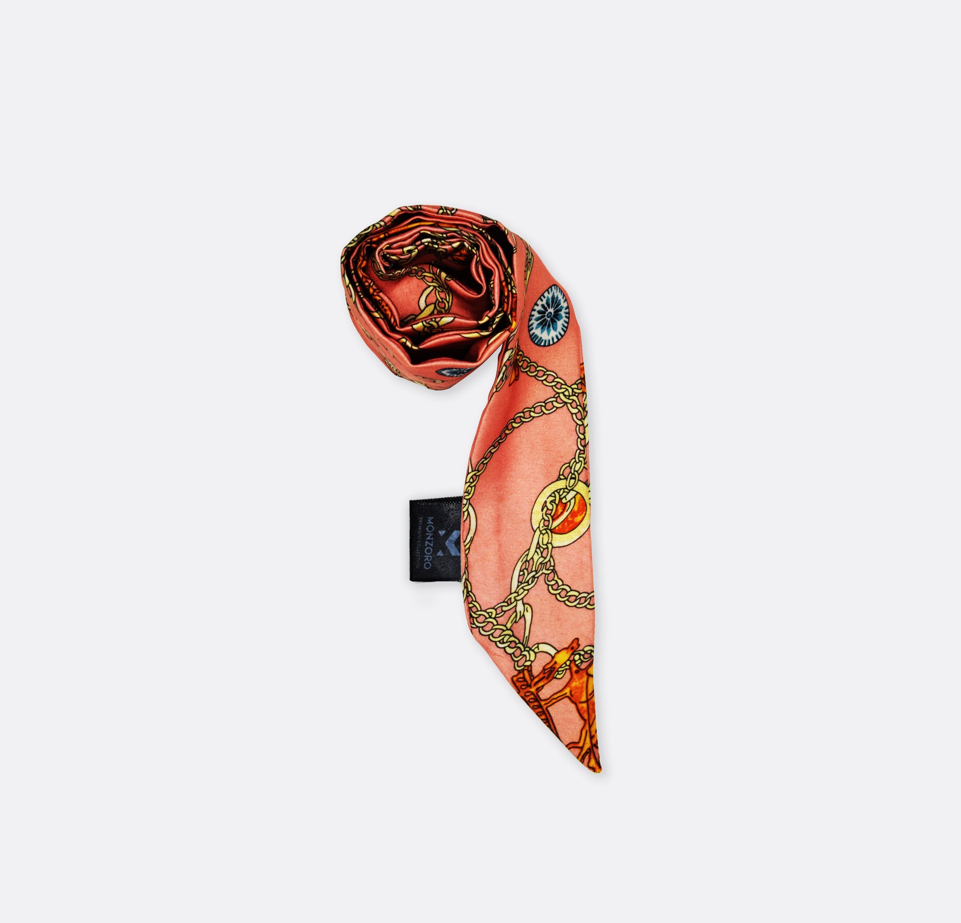 Inspired by classic jewelry motifs, this silk twilly scarf showcases striking curb and link chain patterns in a luxurious layout. Sleek and stylish, it’s perfect for adding a hint of edge and sophistication to any look.