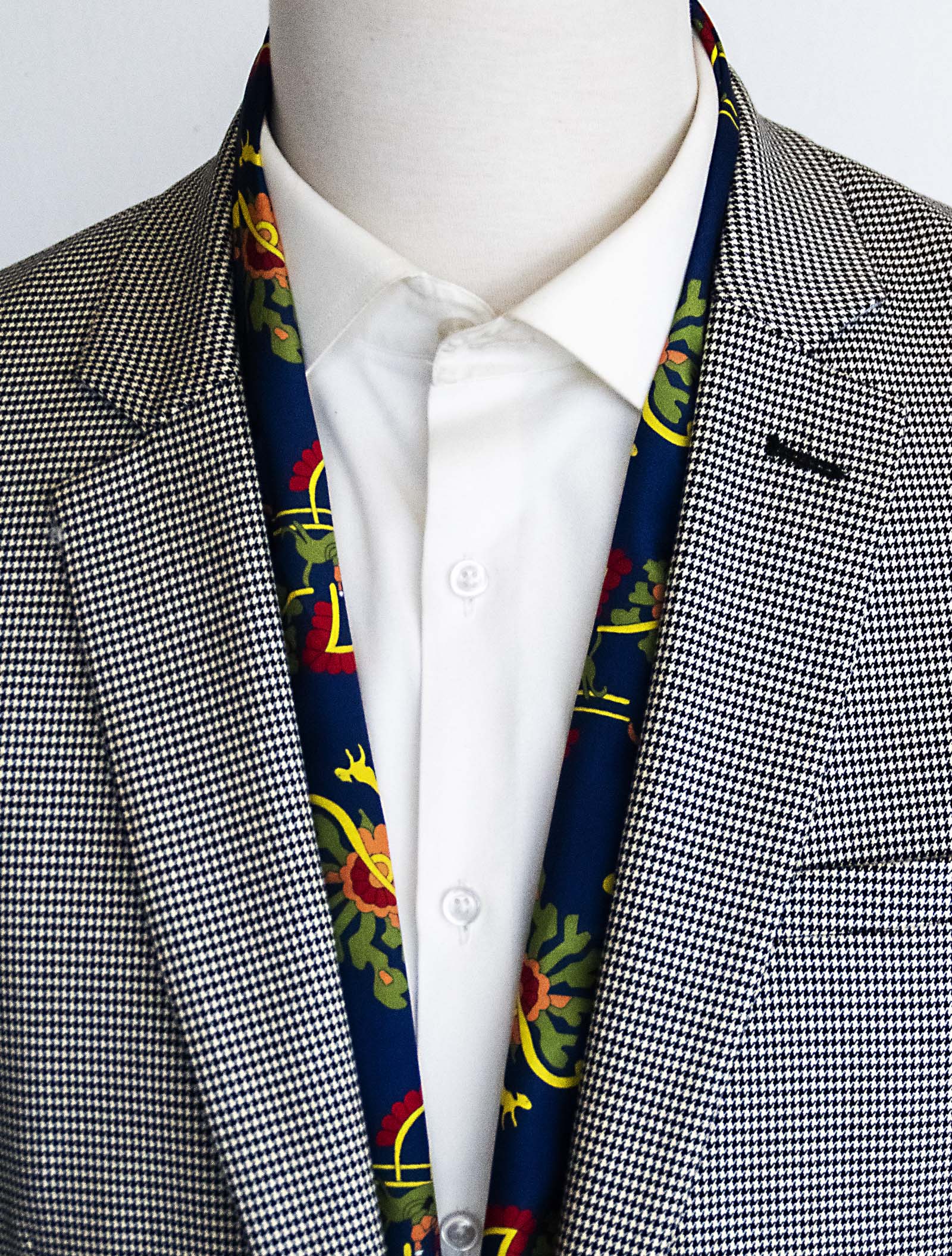 This sophisticated silk scarf showcases an intricate blend of paisley and floral motifs in rich navy blue tones. The luxurious fabric and elegant pattern make it a versatile accessory for elevating both casual and formal attire. A refined touch for the modern gentleman.