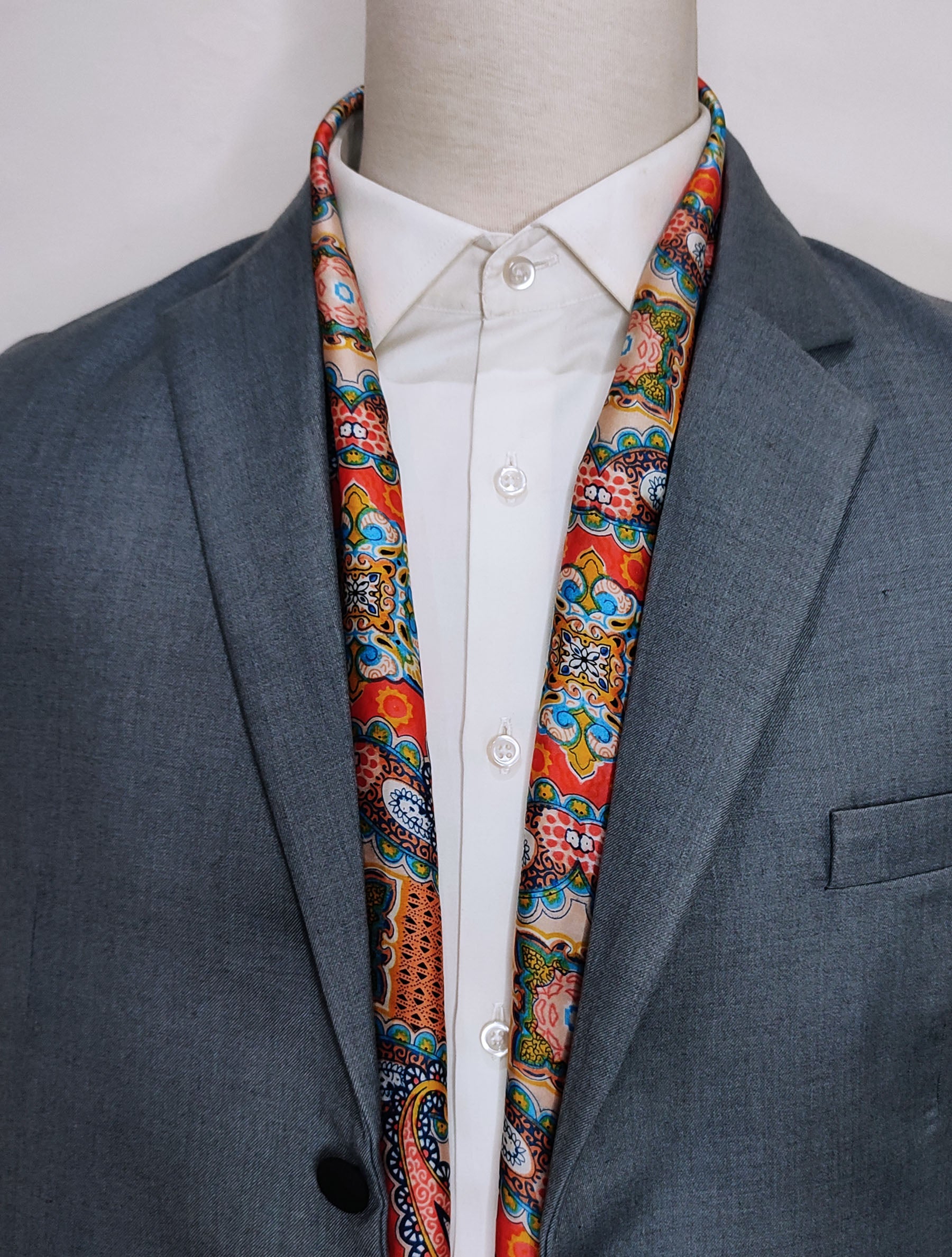 Elegant and expressive, this silk scarf showcases intricate paisley patterns that blend tradition with artistic flair. Its rich colours and luxurious drape make it ideal for adding a cultured touch to formal or smart-casual looks. A timeless piece for the discerning gentleman.